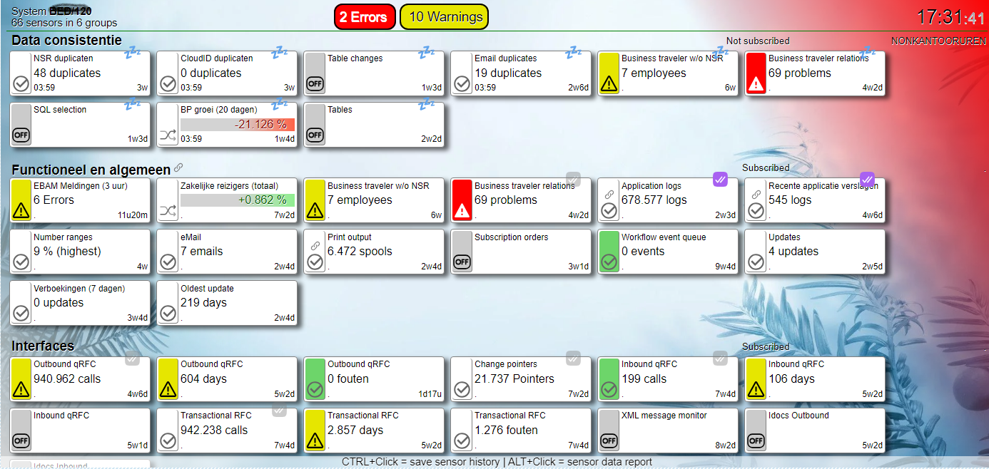 This sensor helps to check the overal health of the batch job administration. The sensor lists the active jobs and caters for an in-sensor registration. The sensor long text can be used to specify each specific job. Contact information (who to contact for this job) and a description (which has no max length) can be specified - information will be displayed on the overview.
